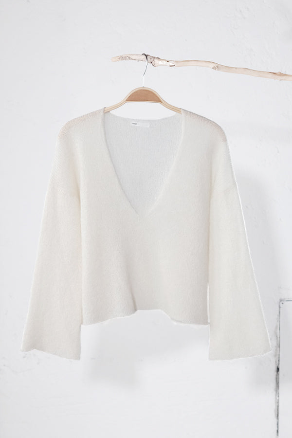 Der amon 'fluffy deep neck' ist ein kastig und locker geschnittenes Oberteil mit leicht ausgestellten Trompetenärmeln. Das Oberteil hat einen tiefen V-Ausschnitt.