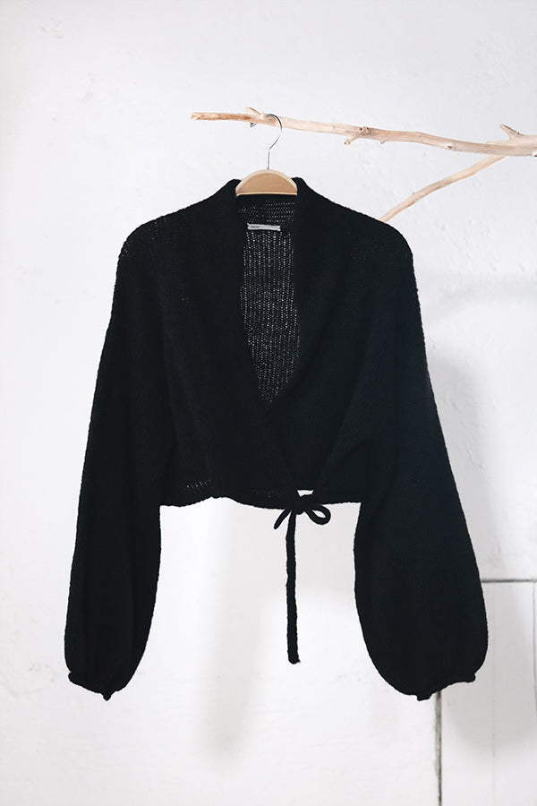 Unser amon 'fluffy puffed sleeve cardigan' ist ein kurzes Wickeljäckchen mit Ballonärmeln.Es kann auf der linken Seite zusammengebunden werden und hat auf der Innenseite rechts einen Knopf zur Befestigung.