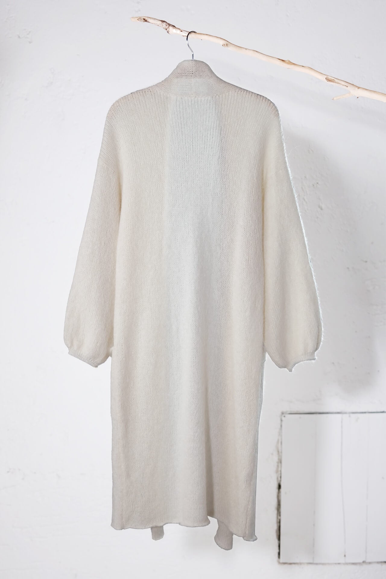 Die 'fluffy puffed sleeve coat' wurde in Prien am Chiemsee designt und im Chiemgau auf einer Handstrickmaschine gefertigt.