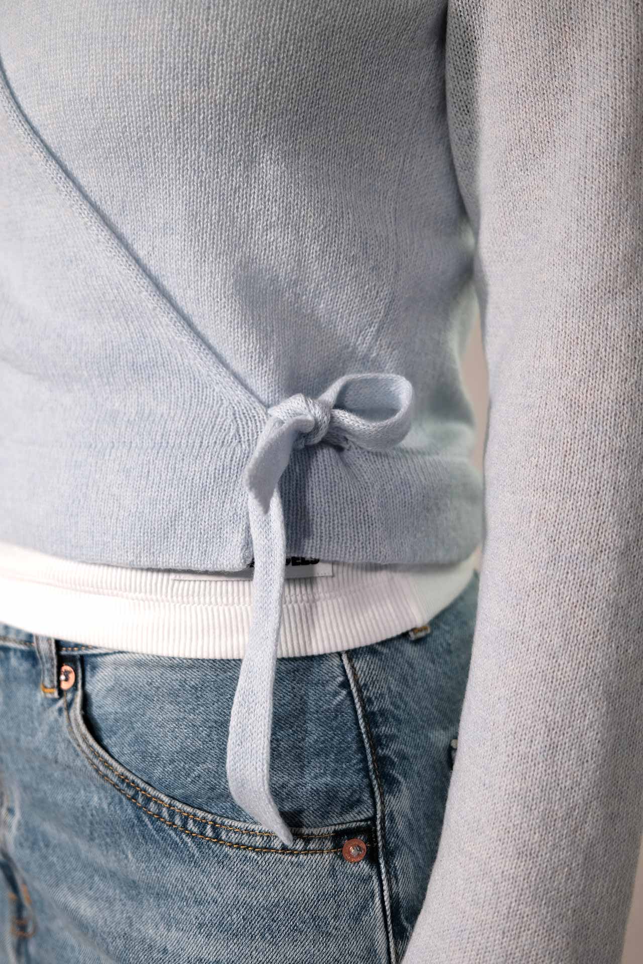 Unser amon 'short wrap cardigan' ist ein kurzes Jäckchen das auf der linken Seite zusammengebunden werden kann und auf der Innenseite rechts einen Knopf zur Befestigung hat.