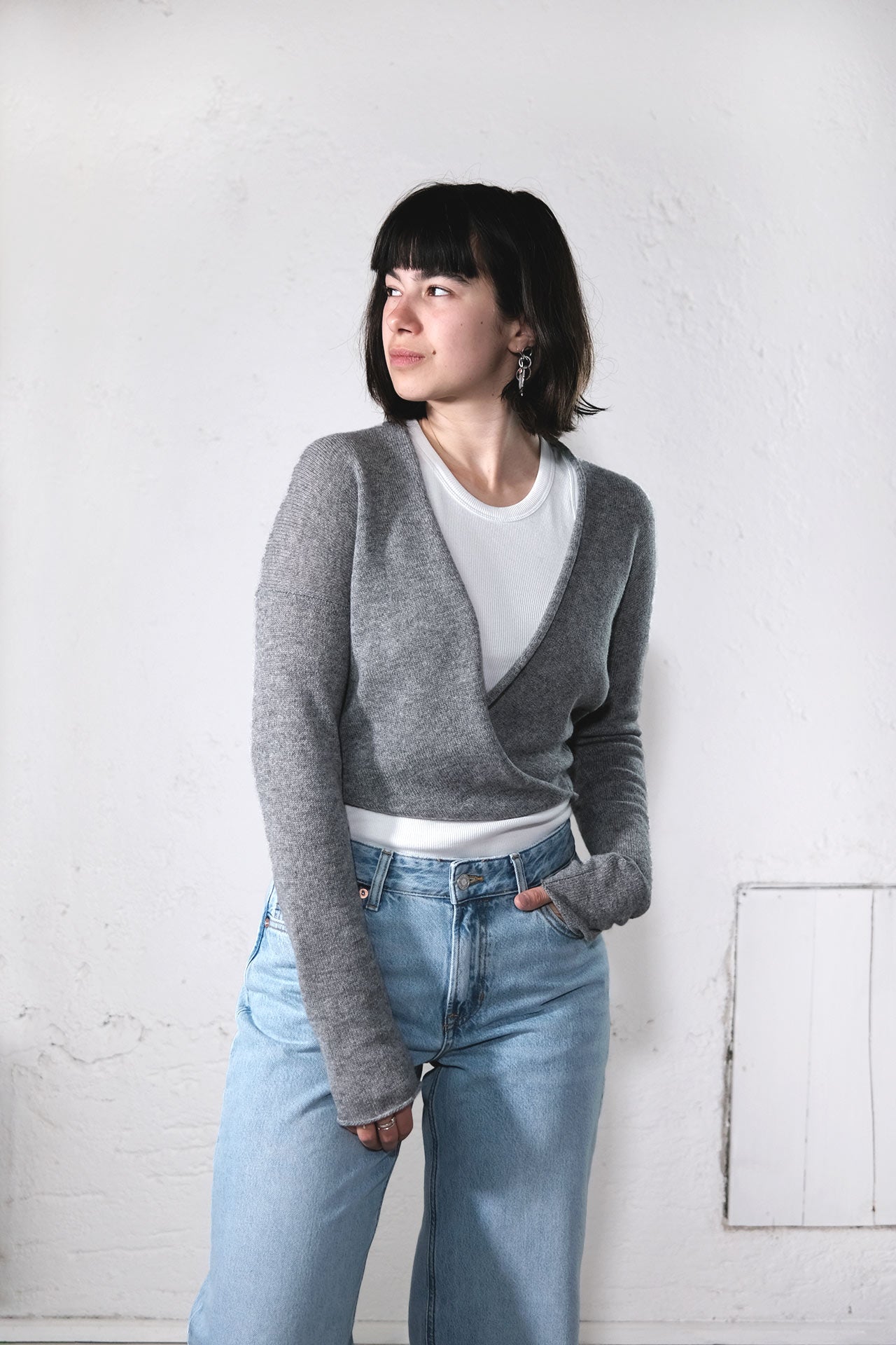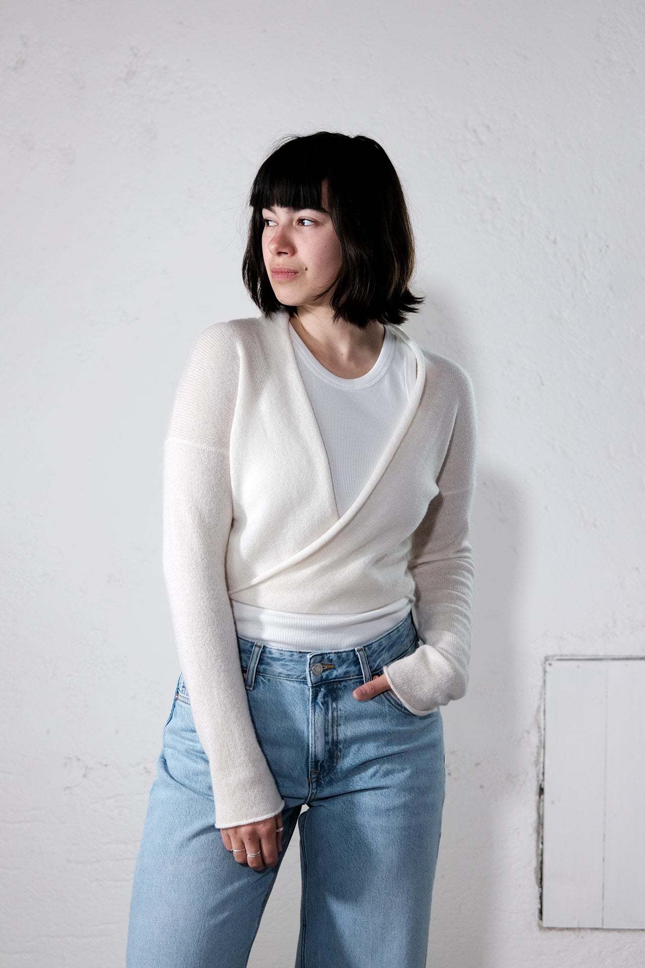 Die leichte amon 'wrap cloud' hat einen kurzen Körper mit einem weiten V-Ausschnitt, der durch das verdrehte Vorderteil entsteht.